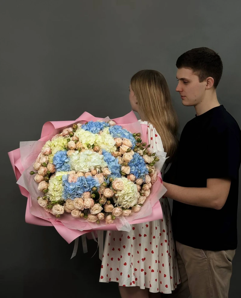 Прекрасный авторский букет из гортензии и кустовых роз Чтобы радовать любимых повод не нужен🥰